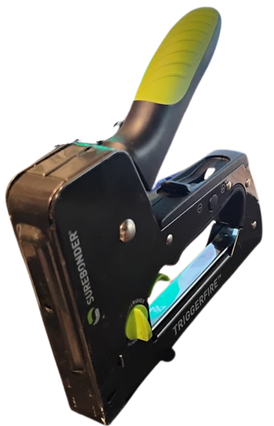 The Surebonder® TRIGGERFIRE™ is the world's first trigger-activated staple gun. This unique tool allows trigger and normal stapling by turning the knob. It uses Surebonder® #4 narrow crown staples or Arrow® T50 type staples. With the Surebonder®, one-handed flush stapling is as easy as 1, 2, 3. Use this stapler for upholstery, fabric, DIY projects, and more. Features: -Squeeze handle that's trigger activated for flush, precise stapling- -Mode selector allows for trigger or normal stapling -Perfect for upholstery, fabric, DIY projects, and more -Durable steel finished body -Staple viewer shows remaining staples -Handle lock for easy storage -User-friendly instructions -Comfort grip handle for extended use -Adjustable drive